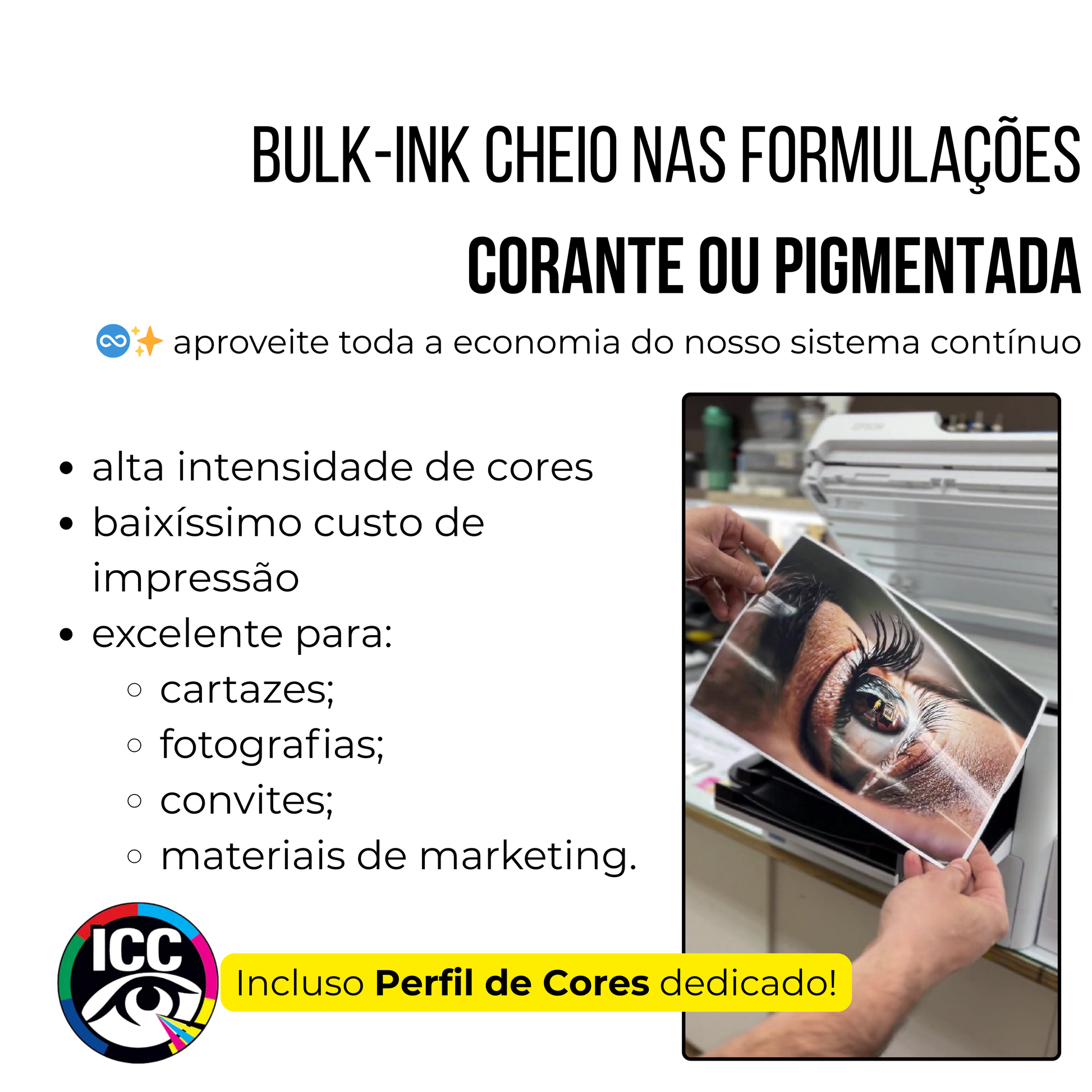 Gráficas Rápidas e Copiadoras Para gráficas que operam com volume contínuo de produção, esta configuração resolve dois desafios simultâneos: elimina interrupções por falta de insumo graças ao tanque bulk de alta capacidade, e reduz expressivamente o custo por página em relação a equipamentos operando com bags originais. A variação corante é indicada para produção de materiais visuais em papéis glossy; a pigmentada, para apostilas, livros, certificados e materiais com exigência de resistência ao manuseio.