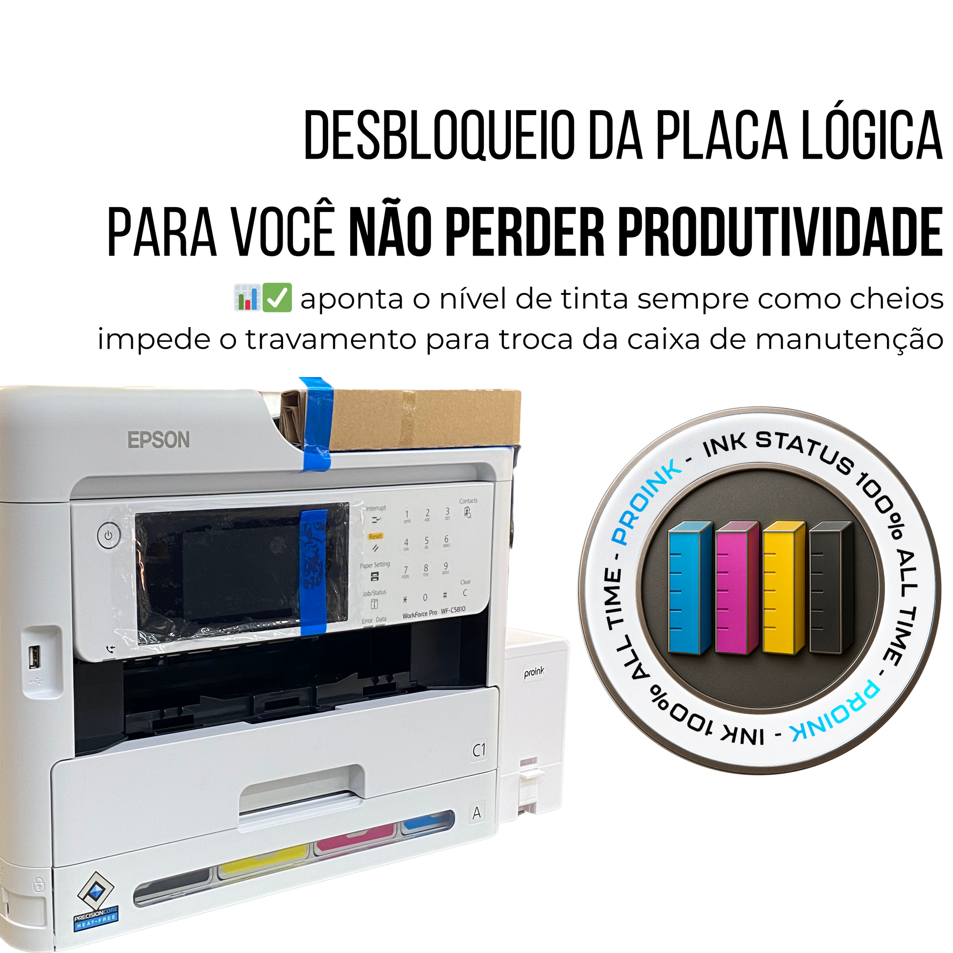 O desbloqueio da placa lógica é uma etapa técnica indispensável da preparação. Sem ela, o firmware original da impressora pode impor travas ao detectar nível de tinta baixo ou exigir substituição da caixa de manutenção, interrompendo a operação de forma forçada. Com o procedimento realizado pela Ink Group, o equipamento opera de forma contínua, sem alertas que bloqueiem a produção.
