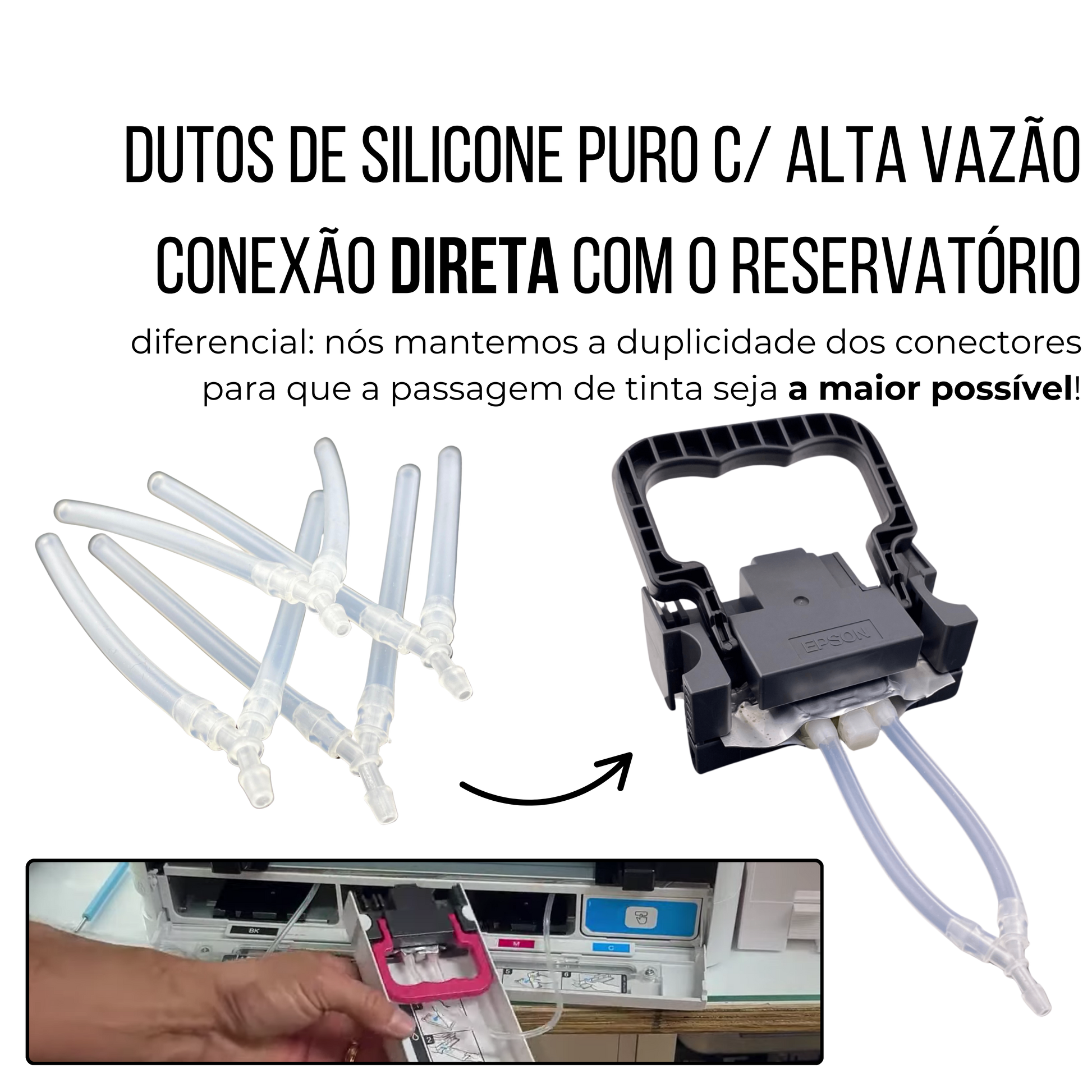 O diferencial central desta preparação está na integração técnica precisa do sistema bulk com os componentes originais do equipamento. A Ink Group mantém os cabeçotes originais das bags de tinta e os adapta com conexão direta ao tanque externo, preservando a duplicidade de conectores para garantir ampla e estável vazão em todas as cores. O conjunto de mangueiras é de silicone puro de alta especificação, desenvolvido para durabilidade e estabilidade de fluxo ao longo do tempo.